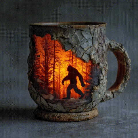 Introducing the Bigfoot Forest Fire Decorative Art Mug — a stunning blend of mythical mystery and rugged craftsmanship. With a bark-textured exterior and a fiery woodland silhouette of the elusive Bigfoot mid-stride, this mug is more than just a vessel… it’s a conversation starter. ☕👣